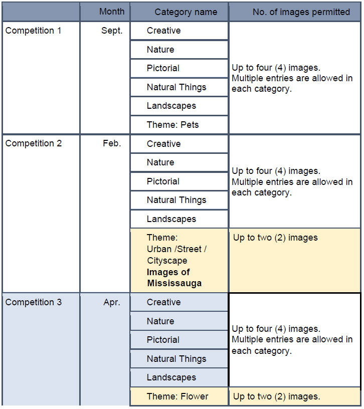 Members may submit images in more than one category but are normally limited to a total of four images per competition. There is an exception whereby an image that is found to be mis-categorised in a competition may be resubmitted as a fourth image in the subsequent competition during the competition year.